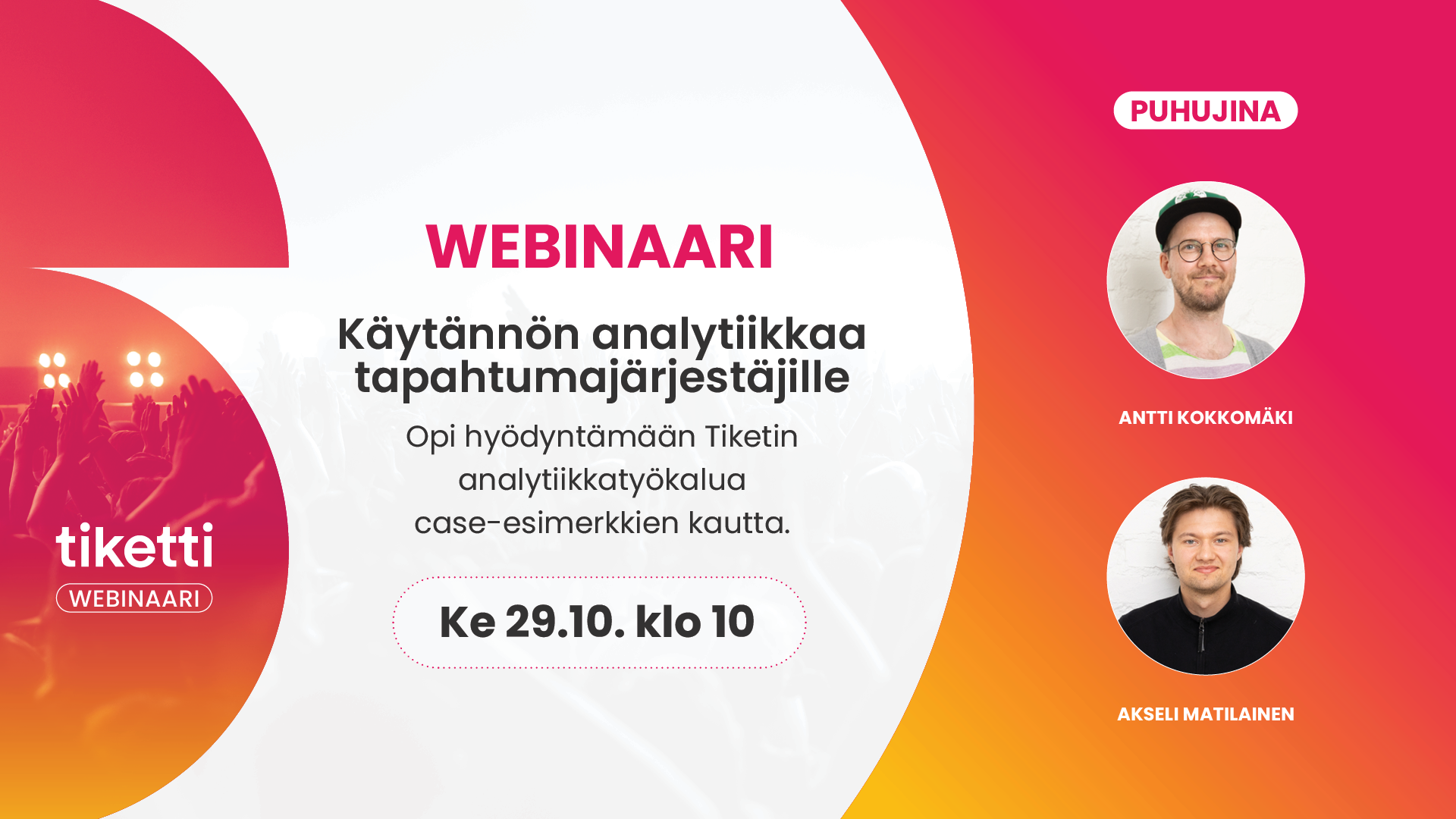 Keskiviikkona 29. lokakuuta klo 10 Tiketin data-analyytikko Antti Kokkomäki ja tuoteomistaja Akseli Matilainen avaavat käytännön esimerkkien kautta, miten Tiketin analytiikkatyökalu auttaa ymmärtämään tapahtumiesi menestystä ja tekemään parempia päätöksiä.
